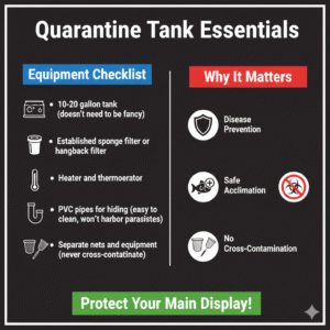 - Set up a hospital/quarantine tank with a capacity of 10-20 gallons and equipped with a sponge filter, heater, and PVC pipe. Hiding spots