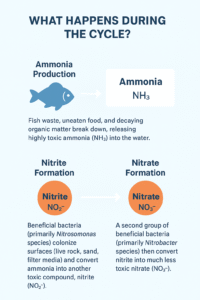 The nitrogen cycle is the core of all successful saltwater aquariums: It’s the natural process by which toxic waste products from marine life are converted into less harmful substances. Without a fully established nitrogen cycle, any fish or corals added will quickly die from ammonia or nitrite poisoning.