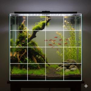 As per this rule, divide your tank into a 3×3 grid. Now, place the focal ornaments right at the point where the lines intersect. This immediately adds a sense of symmetry to the scene and prevents a visually stagnant or unbalanced composition.